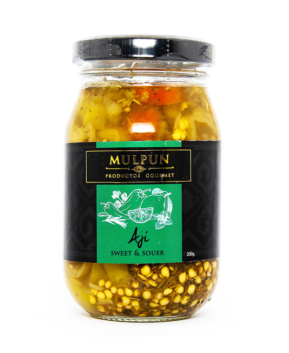 Este producto de la marca sureña Mulpun contiene espectaculares rodajas de ají verde chileno maceradas y elaboradas en una receta especial familiar agridulce, junto a especias como el finas hierbas, romero, tomillo, salvia, estragón, entre otras.